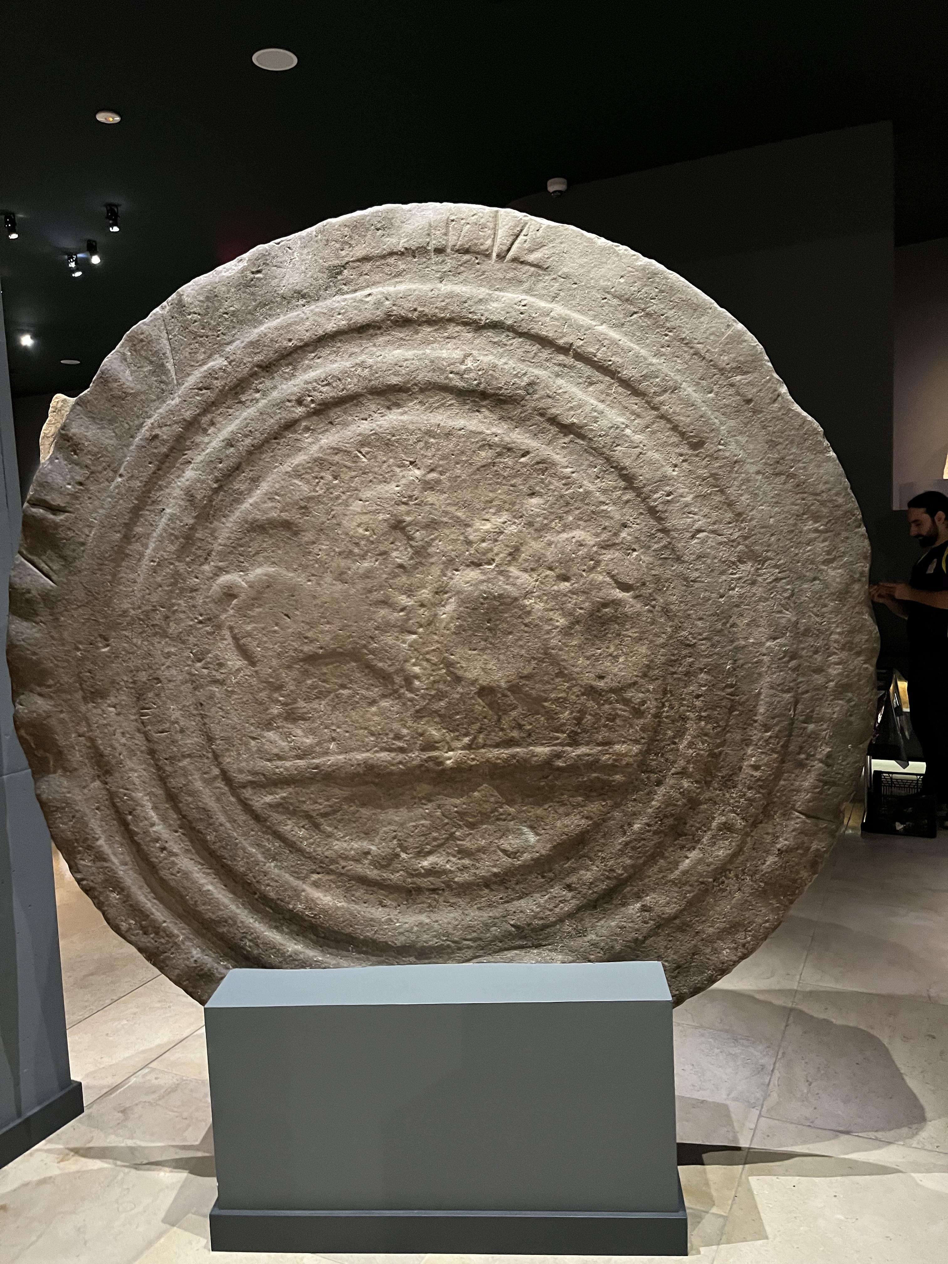 - Antonio, the museum attendant at the Cantabrian Museum of Prehistory and Archaeology. So glad I asked him a question - it evolved into a 30 minute chat. He was so informative and so patient with our spanish. I probably got about 70% of it. I asked him how the Cantabrians - the warrior peoples who lived in the area before the Romans got em - made the stelae, these huge stone circles with designs on them. The designs for the Cantabrian flag come from these structures. One of them (photo below), as Antonio described to me, shows 2 warriors and a horse, who are in heaven, while a dead warrior below them is pictured with a bird, to convey this separation of planes. Antonio kept offering up information we didn't know how to ask for in Spanish, like how they carved the stones, theories, etc.
